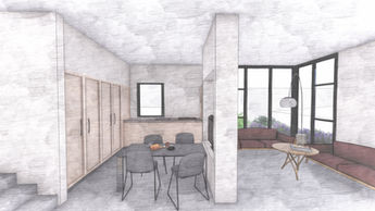 The need for expansion created this design of a two-bedroom residence above an existing structure. Utilizing the existing structure of the house below, the unit was divided into two sections. The lower area accommodates the public spaces, living, dining, and kitchen, while in the upper area are the two bedrooms. The areas are then connected with an open outdoor patio space. Due to the low budget of the project, we opted for a metal structure and a combination of drywalls with paneling.